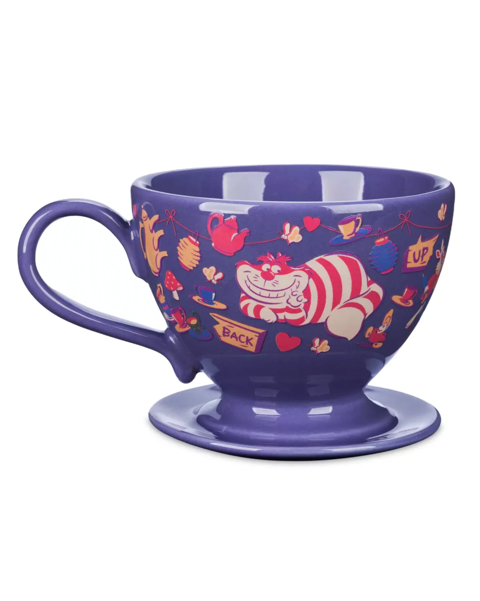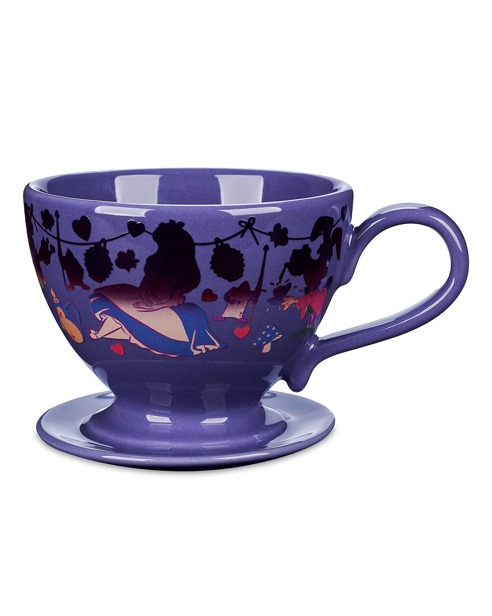 A color-changing teacup mug featuring characters from Disney's 1951 film Alice in Wonderland, including Alice, the Cheshire Cat, March Hare, White Rabbit, and Mad Hatter. The design changes from black to full color when hot liquid is added.